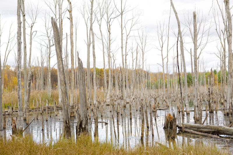 Болото с сухими мертвыми деревьями, бревнами и цветущим рогозом. Экологические проблемы, заболачивание территории, необжитые территории. Естественный фон