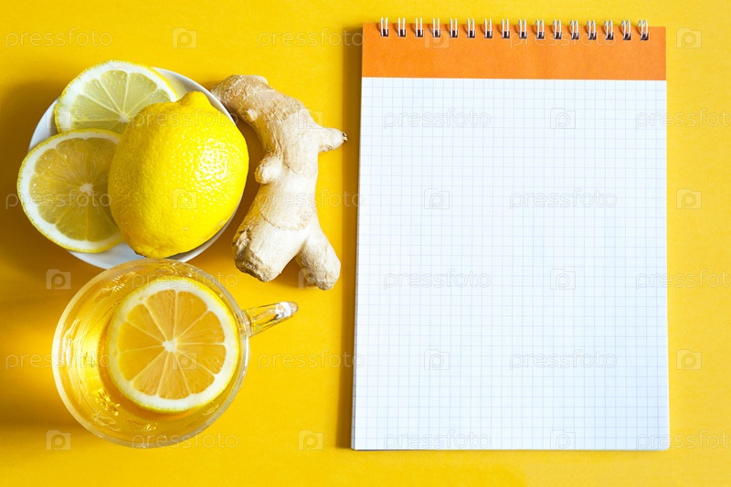 Лекарственный чай в чашке, имбирь, лимон - укрепляют иммунную систему в холодное время года и копируют пространство, лист для заметок. Витаминный напиток для здоровья и ингредиенты на желтом светящемся фоне