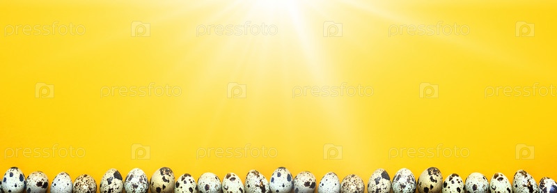 Пятнистые перепелиные яйца на желтом фоне по нижней границе кадра. Пасхальный весенний фон