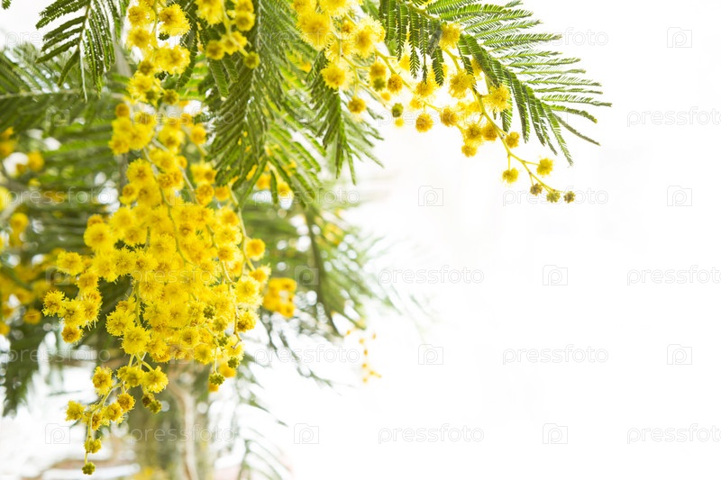 Желтый свежий весенний букет мимозы на белом фоне в фоновом свете. Весна, Пасха, женский день, 8 марта
