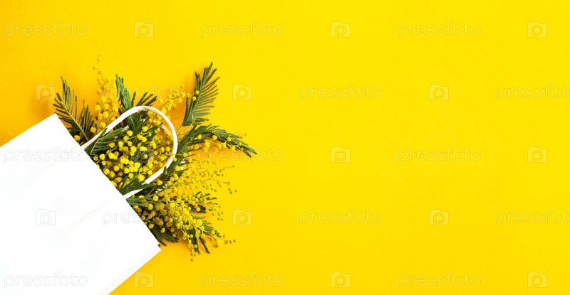 Букет мимозы в белом подарочном пакете. Весенние покупки, подарки и акции к Международному женскому дню. Желтый фон, копирайт