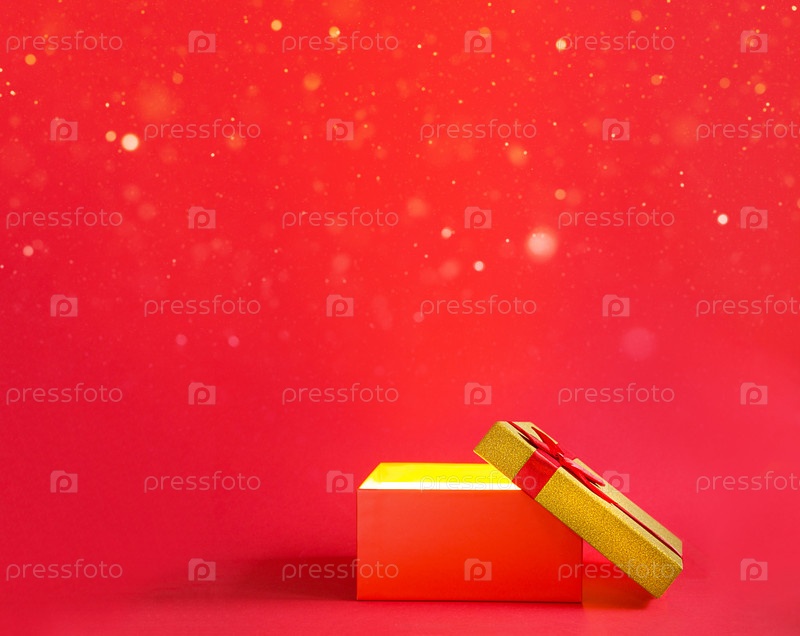 Открытая красная подарочная коробка с бантом с золотым сиянием и блеском внутри на красном фоне, баннер