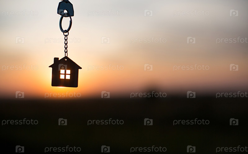 Силуэт фигуры дома с ключом, ручка с брелком на фоне заката. Мечтают о доме, строительстве, переезде в новый дом, ипотеке, аренде и покупке недвижимости. Копировать пространство