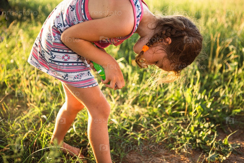 Девушка распыляет спрей от комаров на кожу на природе, которые кусают ее руки и ноги. Защита от укусов насекомых, репеллент безопасен для детей. Отдых на природе, против аллергии. Летнее время