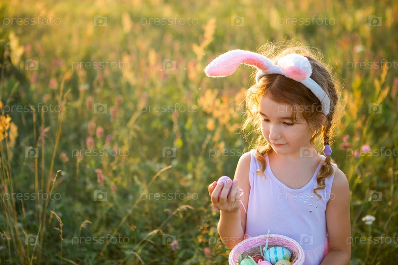 Милая забавная девушка с крашеными пасхальными яйцами весной на природе в поле с золотым солнечным светом и цветами. Праздник Пасхи, пасхальный кролик с ушами, разноцветные яйца в корзине. образ жизни