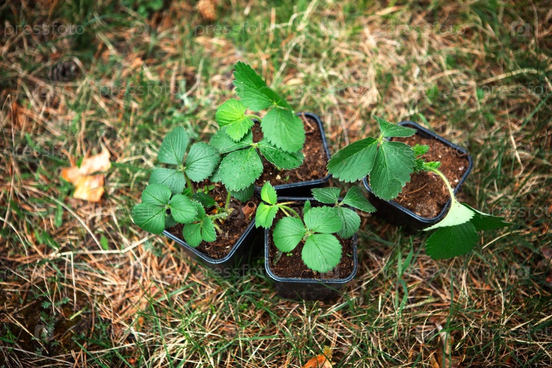 Саженцы клубники в торфяных стаканах на траве, готовые к посадке в саду. Подготовка к посадке, выращивание натуральных ягод на грядке