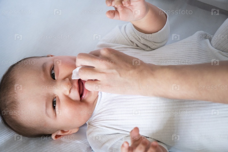 Мама вытирает слюни ребенка салфеткой. Уход за ребенком, прорезывание зубов, слюнотечение