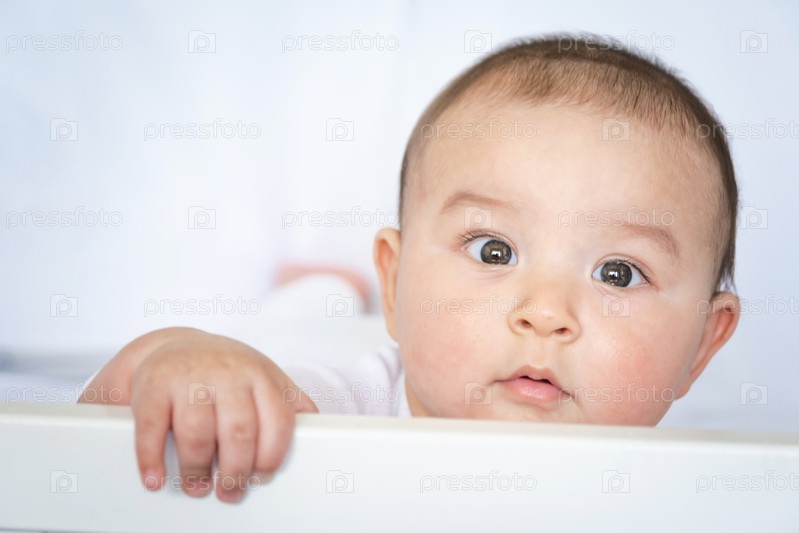 Симпатичный портрет младенца в кроватке крупным планом. Ребенок в белой одежде на белом нижнем белье. Нежность и забота, детские проблемы