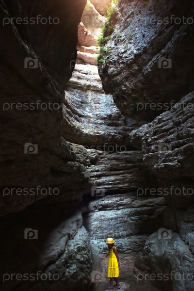 Туристка в желтом платье в высоком ущелье в горах Дагестана. Сельтинский каньон, водопад. Активный отдых,походы