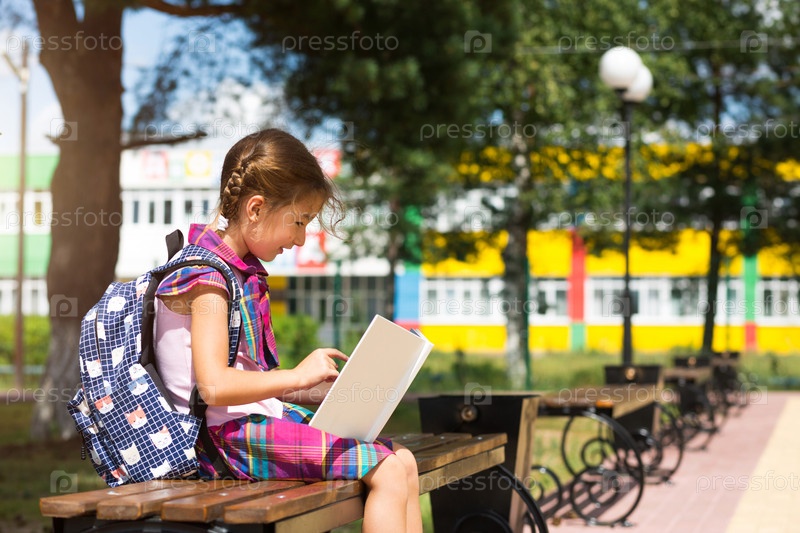 Девушка с рюкзаком сидит на скамейке и читает книгу возле школы. Снова в школу, расписание уроков, дневник с оценками. Образование, классы начальных классов, 1 сентября