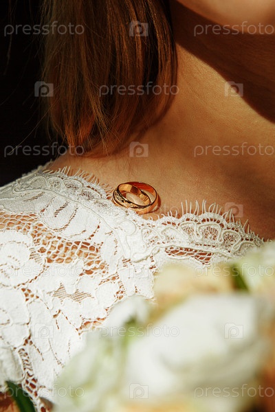 Пара обручальных колец жениха и невесты на плече будущей жены в белом платье. Свадебные аксессуары, церемония, украшения, Букет невесты из розовых роз. Место для текста