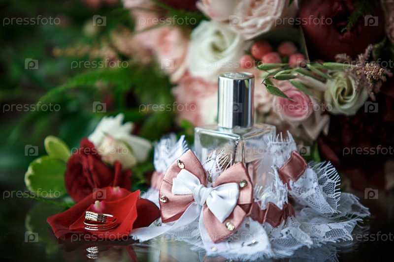 Свадебные аксессуары для жениха и невесты: букет красных, розовых и белых роз, бутоньерка, золотые обручальные кольца, кружевная подвязка с бантом, духи. Ювелирные изделия, флористика. Место для текста