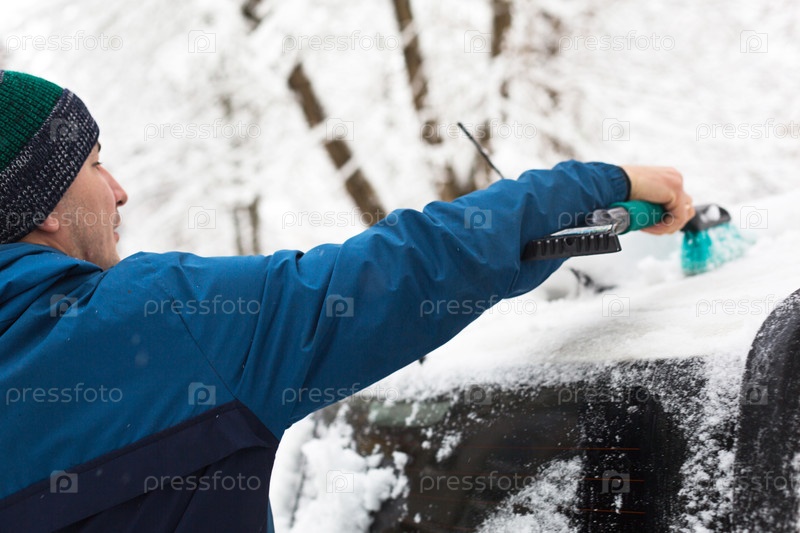 Мужчина стряхивает снег с машины после снегопада. Рука в синей куртке с автомобильной метлой на белом теле. Зимние погодные условия