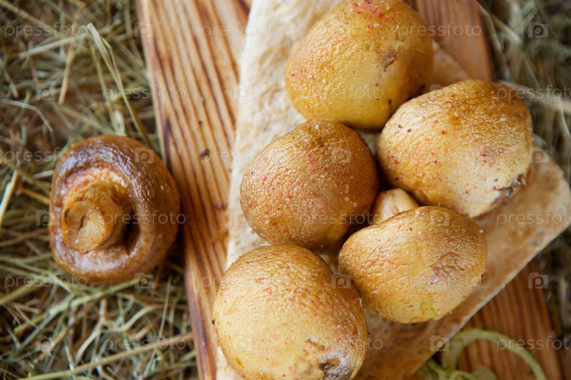 Жареные грибы и шампиньоны лежат на деревянной доске