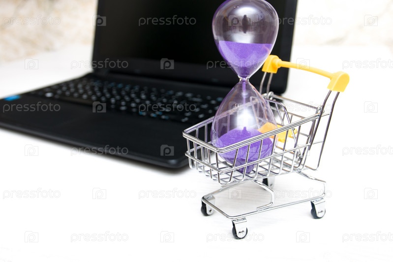 Песочные часы в тележке для покупок рядом с ноутбуком на сером столе, концепция онлайн-покупок