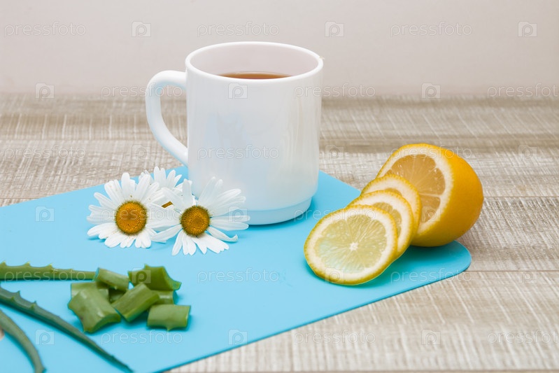 Натуральные продукты для лечения сезонных простуд, лимон, алоэ, ромашковый чай, синий фон, деревянный стол, копия пространства
