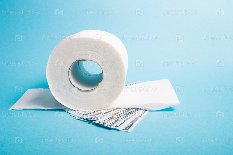 Белый рулон туалетной бумаги и стопка долларов синий фон копией пространства