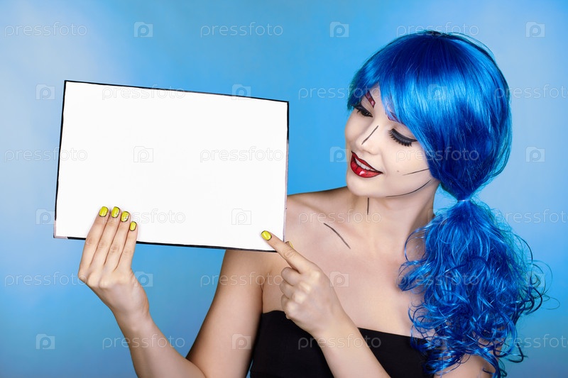 Портрет молодой женщины в стиле комического поп-арта. Женщина с бумагой в руках