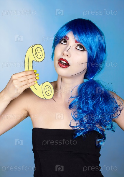 Портрет молодой женщины в стиле комического поп-арта. Женщина в синем парике на синем фоне звонит по телефону