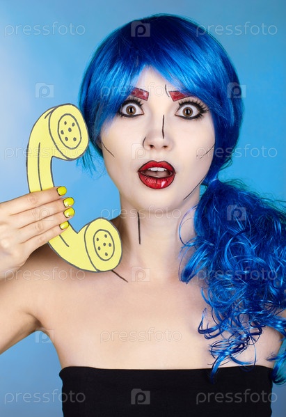 Портрет молодой женщины в стиле комического поп-арта. Женщина в синем парике на синем фоне звонит по телефону