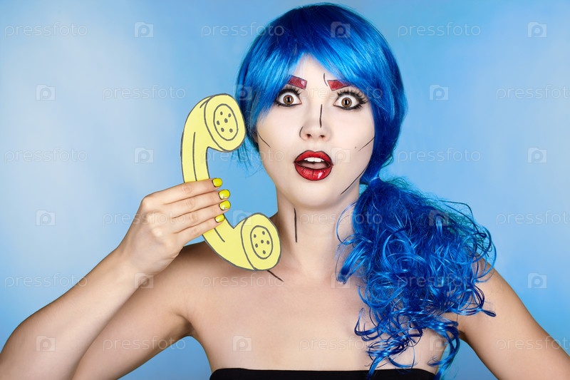 Портрет молодой женщины в стиле комического поп-арта. Женщина в синем парике на синем фоне звонит по телефону