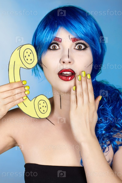 Портрет молодой женщины в стиле комического поп-арта. Женщина в синем парике на синем фоне звонит по телефону