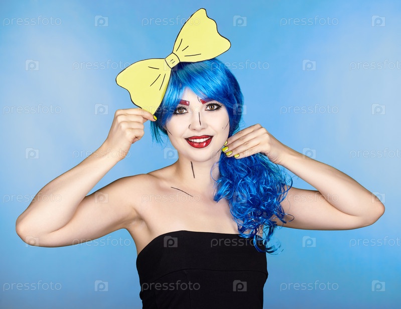 Портрет молодой женщины в стиле комического поп-арта. Девушка с желтой бабочкой в руках