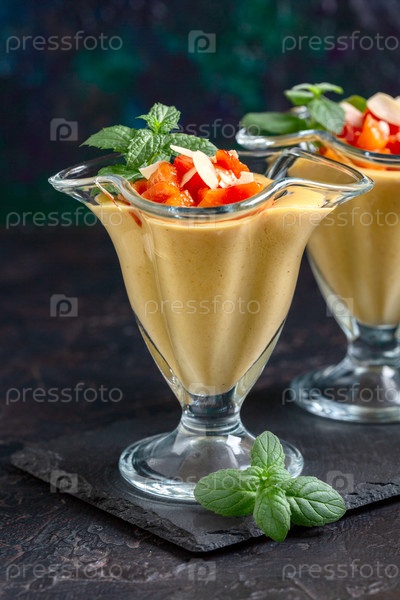 Десерт с кусочками персика и мятой