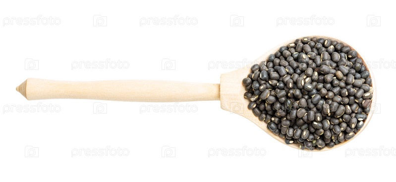 Вид сверху на сырые цельные черные бобы урад в ложке