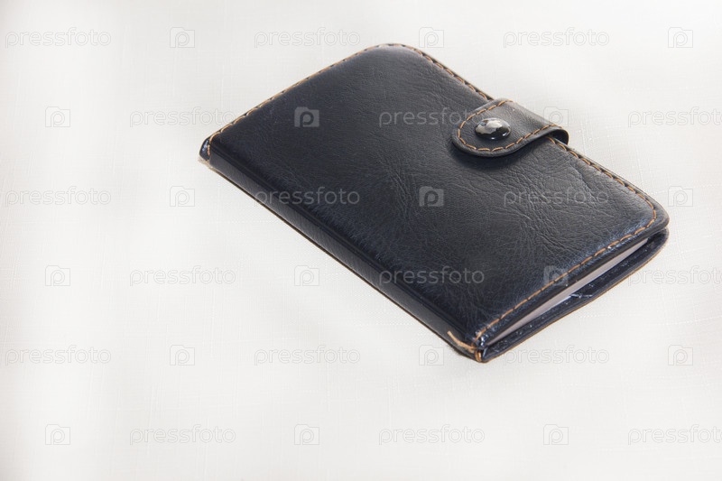 Черный кожаный блокнот с коричневой строчкой на кнопке на белом фоне