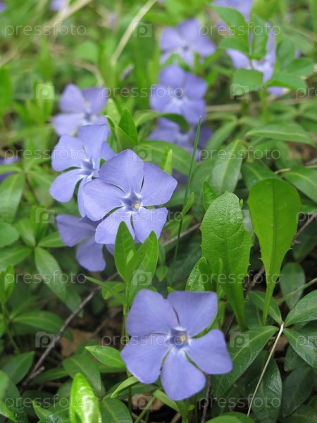 Весенний голубой стекающийся многолетний цветок барвинок (Apocynaceae Vinca)
