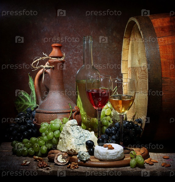 Натюрморт с вином и сыром на деревянном фоне
