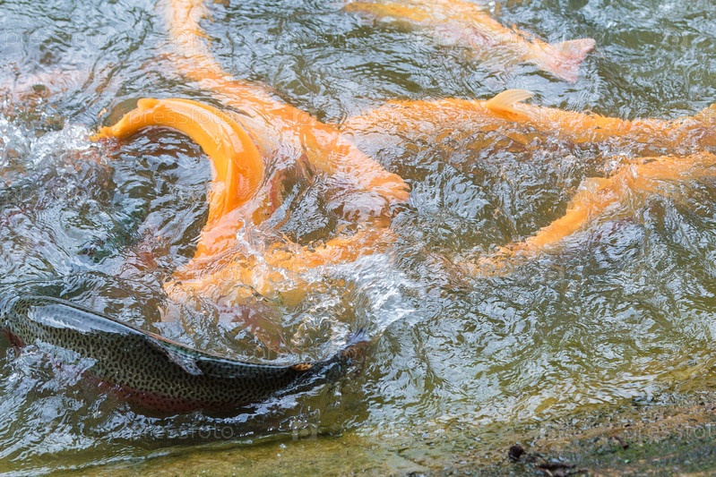 Золотая, радужная форель на рыбной ферме плещется в воде