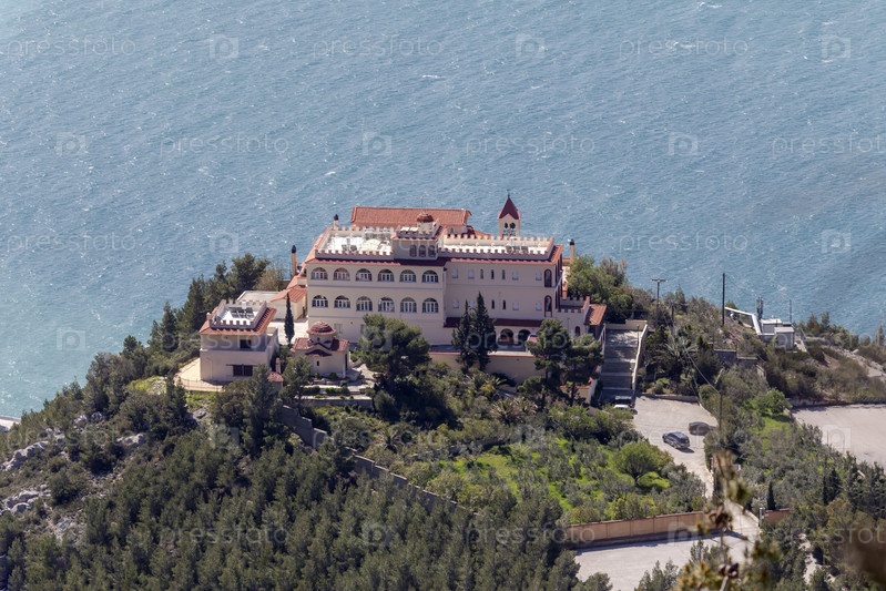 Большой православный монастырь на фоне моря (Пелопоннес, Греция)