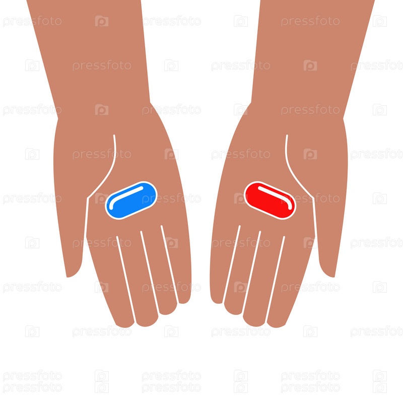 Руки предлагают на выбор красный или синий планшет. Понятие выбора в жизни, альтернативы, ссылка на матрицу. Векторная иллюстрация