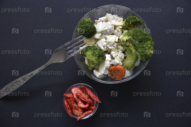 Вкусный салат в стеклянной салатнице и красные креветки на черном фоне. Вкусный завтрак из салата и креветок