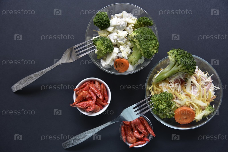 Вкусный салат в стеклянной салатнице и красные креветки на черном фоне. Вкусный завтрак из салата и креветок