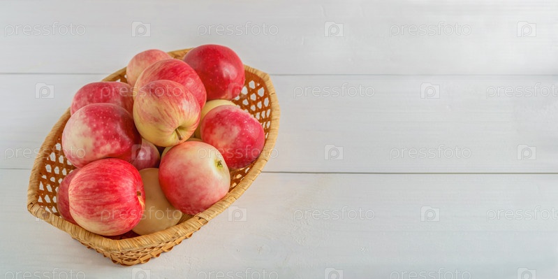 Красные спелые яблоки в плетеной корзине. Деревянный фон. Копировать пространство