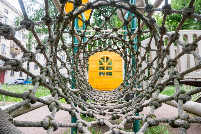 Вид изнутри на длинную трубу из веревочной сетки, в конце туннеля желтая детская площадка с размытым фоном