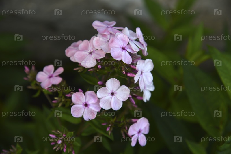 Розовые цветы флокса метельчатого с боке из летнего сада крупным планом. Мелкие цветы флоксов