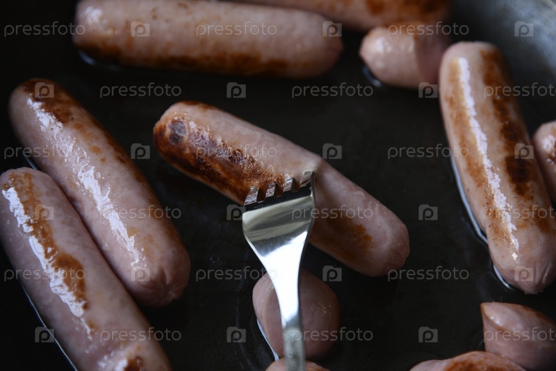 Жареные мясные колбаски на черной сковороде. Вкусный завтрак из жареных сосисок
