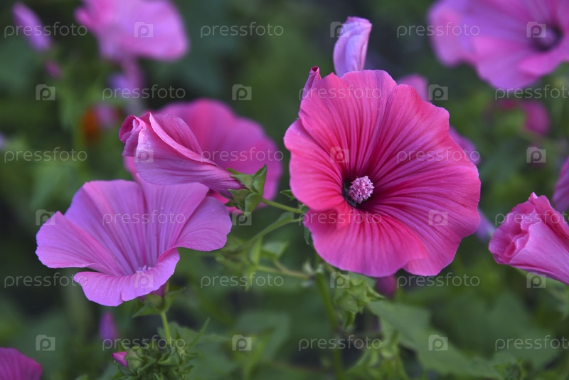 Розовые цветы лаватера крупным планом в вечернем летнем саду. Летом шиповник лаватера