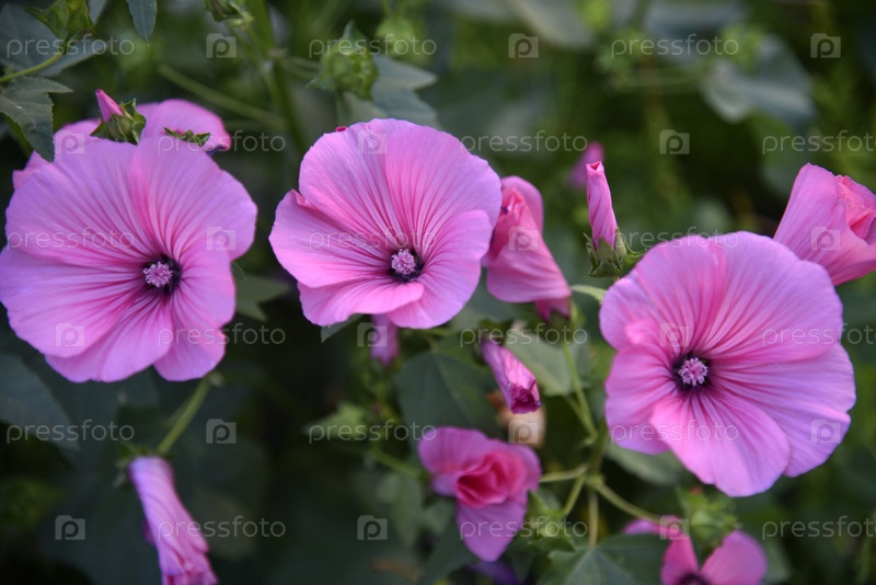 Розовые цветы лаватера крупным планом в вечернем летнем саду. Летом шиповник лаватера