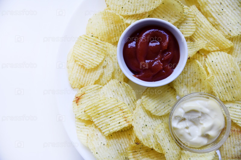 Рифленые чипсы на большой тарелке с соусом и майонезом. Жареный картофель быстрого приготовления с соусами
