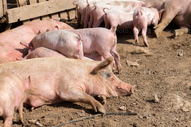 Мать-свинья со своими маленькими поросятами в загоне на ферме