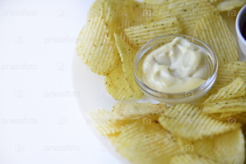 Рифленые чипсы на большой тарелке с соусом и майонезом. Жареный картофель быстрого приготовления с соусами