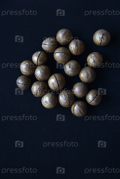Не сломанные орехи макадамии на черном фоне в группе