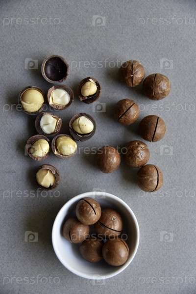 Вкусный орех макадамии в чашке на сером фоне. Разбитые орехи и скорлупа