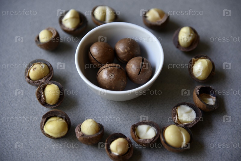 Вкусный орех макадамии в чашке на сером фоне. Разбитые орехи и скорлупа