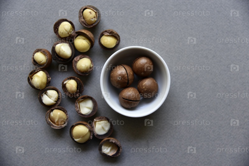 Вкусный орех макадамии в чашке на сером фоне. Разбитые орехи и скорлупа